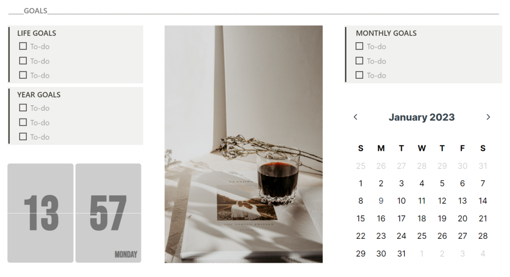 This dashboard is the perfect way to organize the new years! It's a combination of personal planning and work related planning. The dashboard is completly custumizable. The pages linked on this dashboard are completly empty so a perfect place to let your own creative ideas flow!