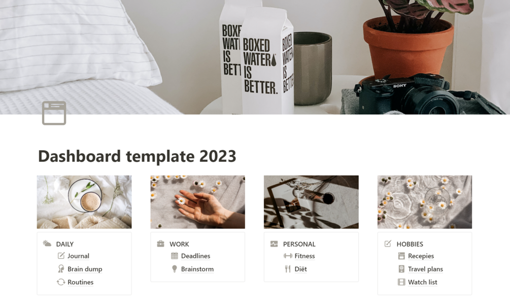 This dashboard is the perfect way to organize the new years! It's a combination of personal planning and work related planning. The dashboard is completly custumizable. The pages linked on this dashboard are completly empty so a perfect place to let your own creative ideas flow!